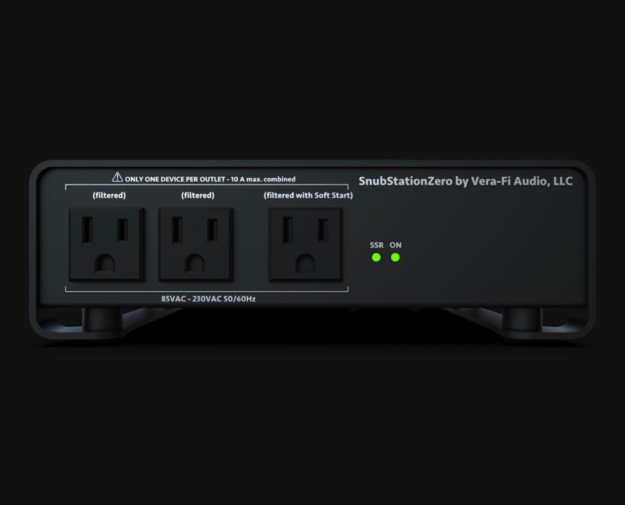 The main soft start circuit path can be used to filter a single device up to 10A of current. There are two additional NEMA outlet sockets that can provide power for smaller accessories that do not need the soft start feature but will benefit from the DC blocker and premium German-made Schaffner integrated EMI filter module.