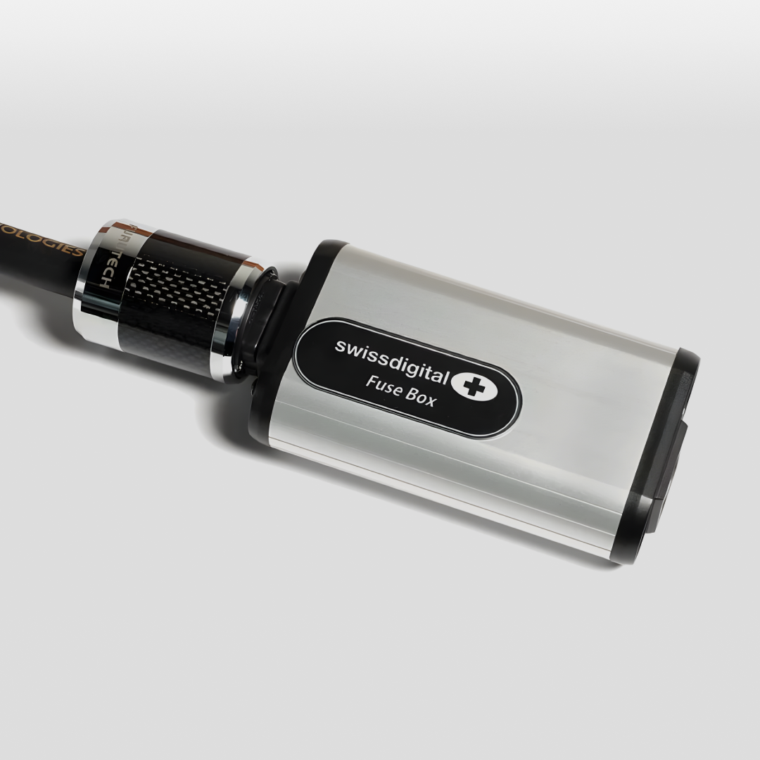 Swiss Digital Fuse Box has an IEC C13 inlet, and a NEMA 15 outlet on the other side. This allows you to use your performance power cable of choice to feed the Fuse Box, and still allows you to enjoy the benefits if you have an integral power cable on your audio component.