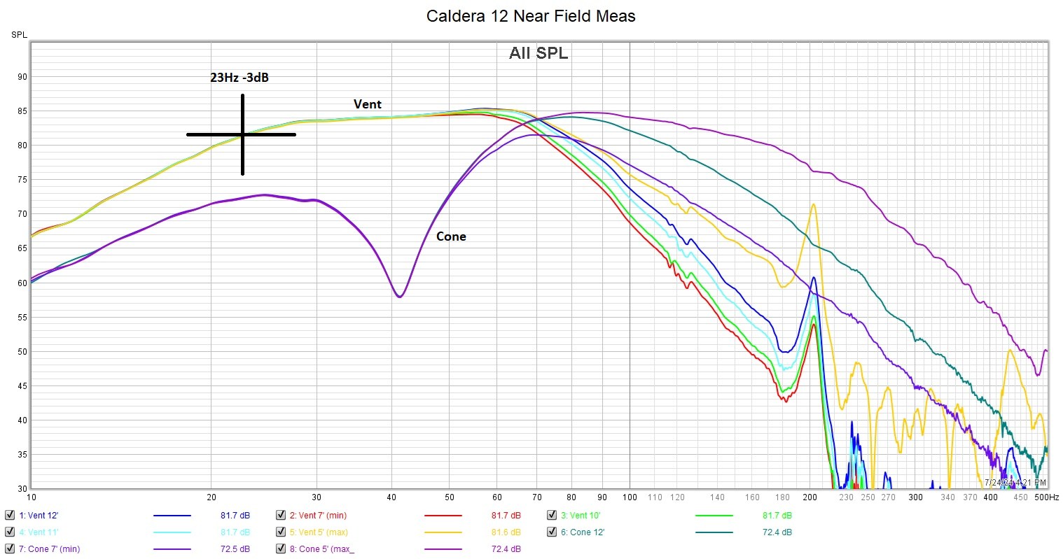 The Caldera 12 sub near field measurement (mic at vent exit plane and 10mm from cone) shows a -3dB F3 of 23Hz.