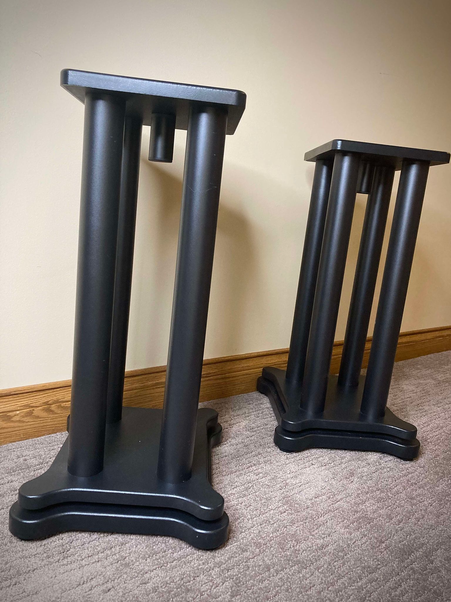One disclaimer, I purchased them when Vera-fi had $100 off everything on their website. So I only paid for shipping costs. However, even if I had paid full price, they still would be a bargain. The stands are very sturdy with the four columns supporting the top plate, and the rubber washers decoupling the stand from the base is a nice touch as well being visually appealing. The top plate and the base having a leather-like appearance is classy too. With the new stands, using them for my left and right channel speakers seem to make the sound more smooth and focused. Overall, I'm very pleased with their appearance and how they improved my home theater system. Good job! Thanks, Charles.